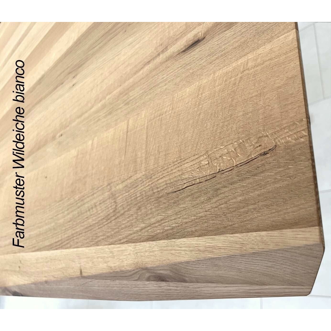 Die Oberfläche des Tisches ist geölt, was nicht nur das natürliche Aussehen der Wildeiche betont, sondern auch die Pflegeleichtigkeit erhöht. Die harmonische Farbkombination aus Weiß und Schwarz fügt sich nahtlos in verschiedene Wohnstile ein und macht diesen Esstisch zu einem vielseitigen Gestaltungselement in Ihrem Essbereich oder in der Küche.