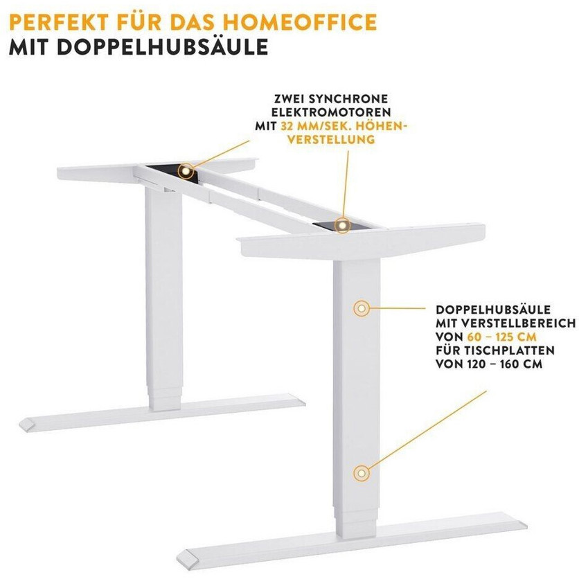 Die Ausstattung mit einem elektrischen Niveauausgleich ermöglicht es Ihnen, die Arbeitshöhe des Schreibtisches bequem zwischen 60 und 125 cm einzustellen. Mit einer Höhenverstellgeschwindigkeit von 32 mm/s und einer maximalen Lautstärke von nur 50 dB ist der Wechsel zwischen den Höhen nahezu geräuschlos. Der Schreibtisch hat eine maximale Belastbarkeit von 38 kg, sodass er all Ihren Anforderungen im Büro gerecht werden kann.