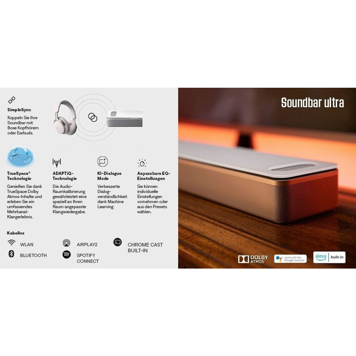 Außerdem ist die Soundbar mit Google Assistant ausgestattet, sodass Sie Ihr Soundsystem bequem mit Ihrer Stimme steuern können. Lassen Sie sich von dem erstklassigen Sound und den praktischen Funktionen der Bose Smart Soundbar Ultra Black begeistern!