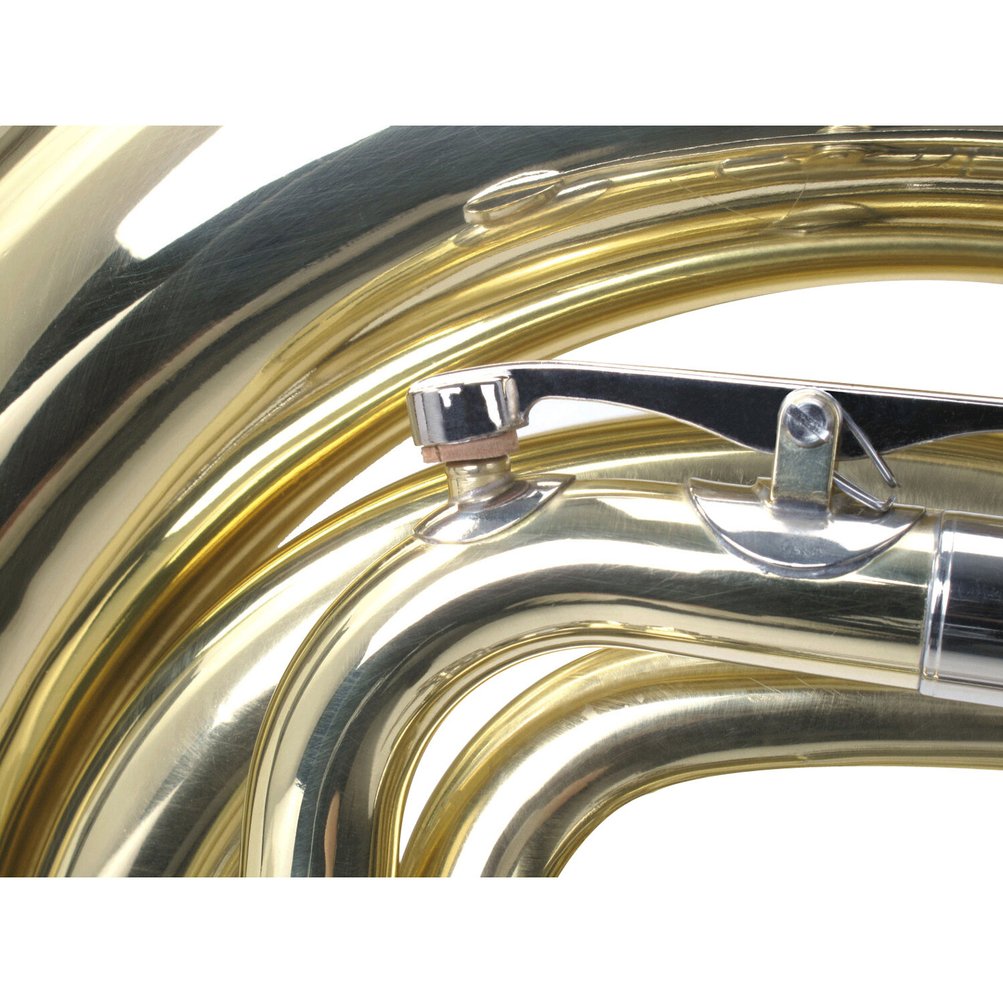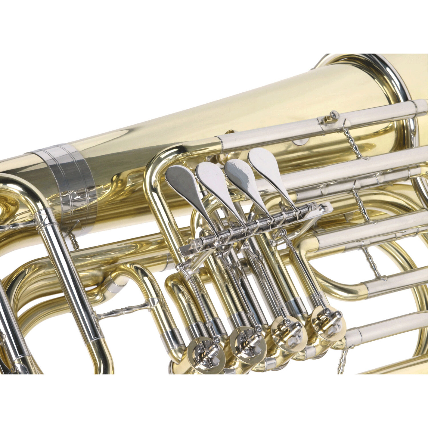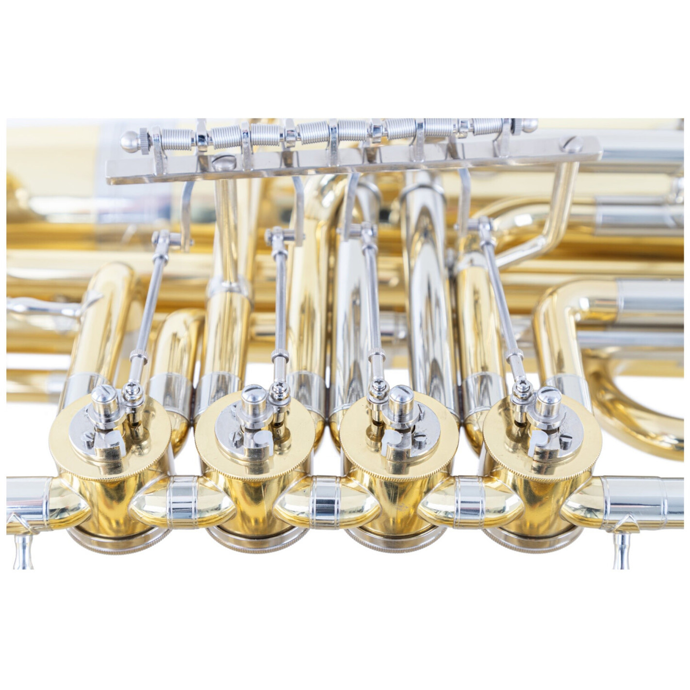 Der Schallbecher besteht aus massivem Messing mit einem beeindruckenden Durchmesser von 380 mm, was zu einem vollen, warmen Klang beiträgt. Der Bohrungsdurchmesser von 16 mm und die 4 Einsatzventile im Drehventil-/Zylinderventil-System ermöglichen eine umfassende Klangkontrolle und Flexibilität beim Spielen.