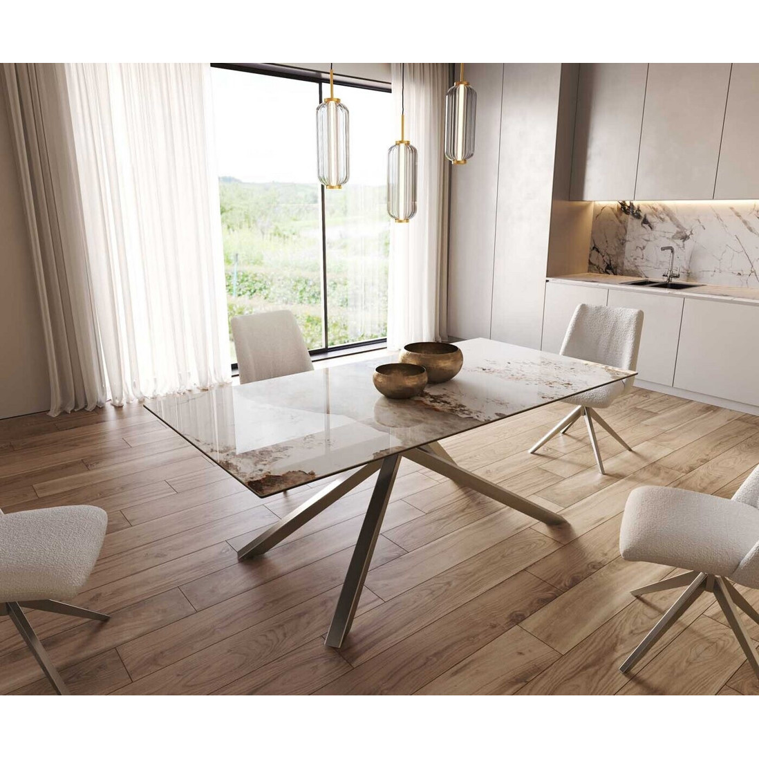 Der Tisch ist aus hochwertiger Keramik in einem ansprechenden beige Farbton gefertigt und verleiht Ihrem Raum ein modernes und zeitloses Flair. Die Tischplatte hat eine Stärke von 10 mm, was nicht nur für Ästhetik, sondern auch für Stabilität sorgt.