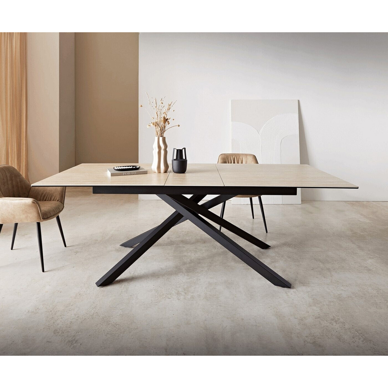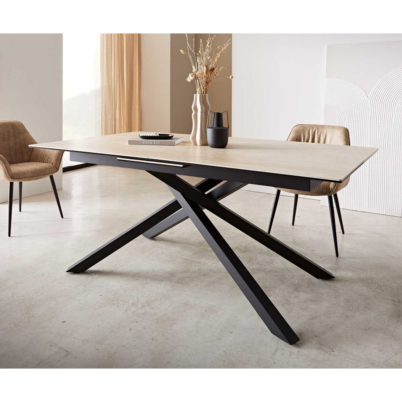 Das Gestell aus schwarzem Metall verleiht dem Tisch eine robuste Note, während die rechteckige Form und die pulverbeschichtete, matte Oberfläche für zeitlose Eleganz sorgen. Die Tischplatte besteht aus kratzfester Keramik in einer ansprechenden, beigen Farbe, die leicht zu reinigen ist und jedem Essbereich eine besondere Note verleiht.