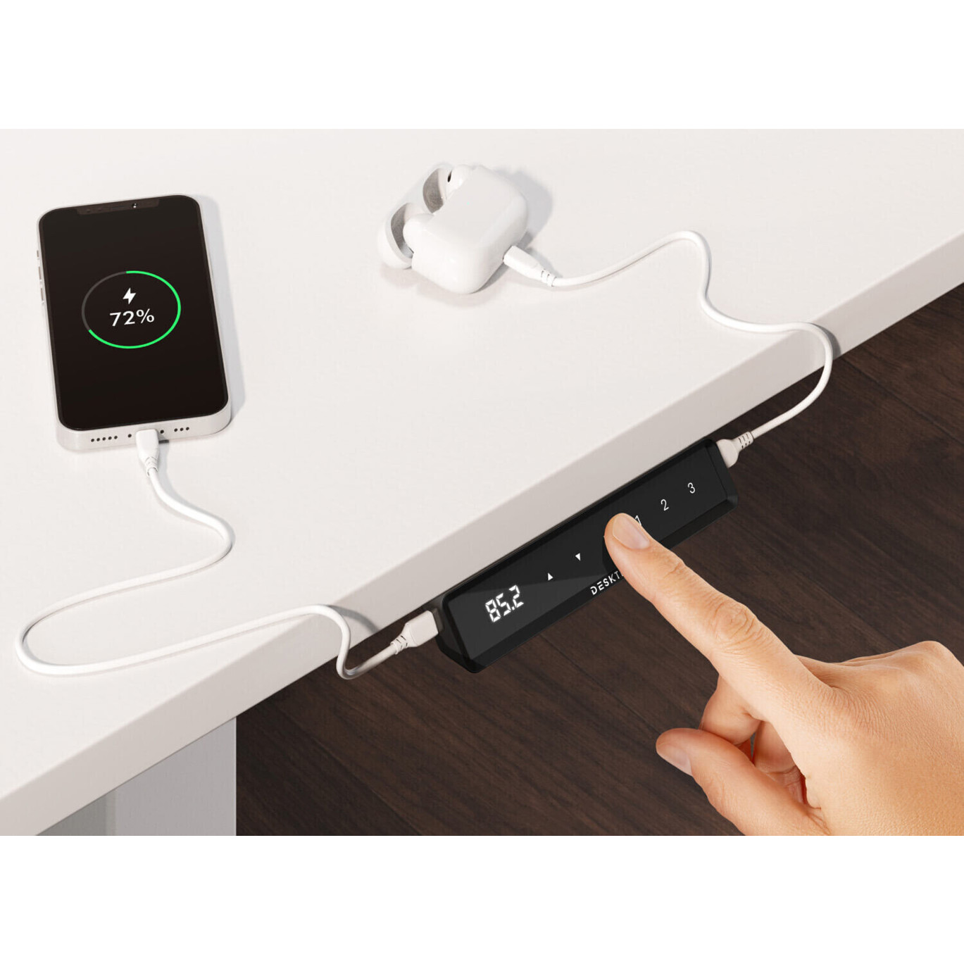 Besonders hervorzuheben sind die durchdachten Funktionen dieses Modells. Der Desktronic Home One ist mit einer elektrischen Höhenverstellung ausgestattet, die es Ihnen ermöglicht, die ideale Arbeitshöhe ganz nach Ihren Bedürfnissen anzupassen. Zudem bietet er praktische Features wie einen USB-Anschluss, einen USB-C-Anschluss sowie einen Kollisionsschutz für zusätzliche Sicherheit während der Nutzung. Der integrierte Niveauausgleich sorgt dafür, dass der Schreibtisch immer stabil steht, egal wo Sie ihn platzieren.