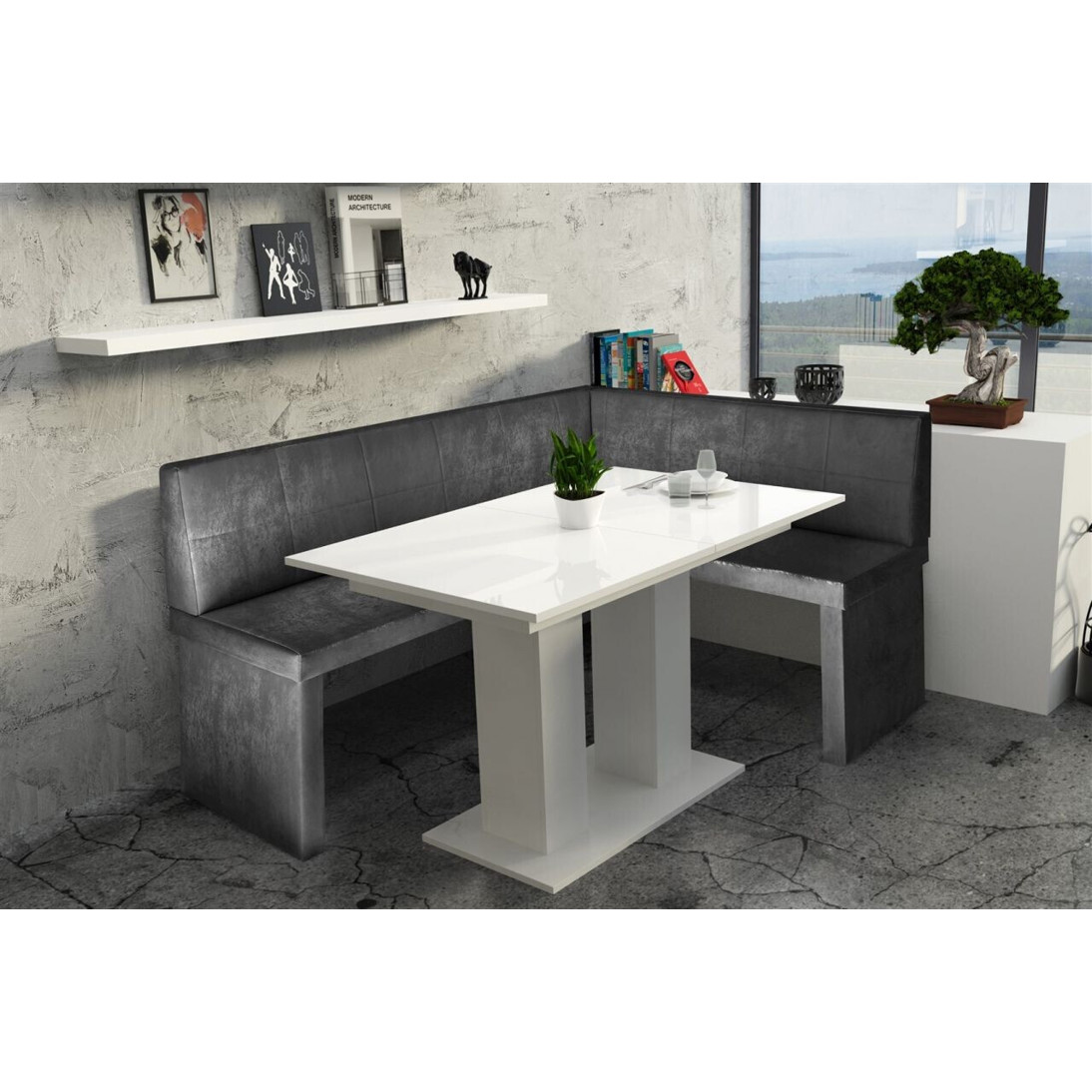 Eckbankgruppe ROBIN L - Vintage Schwarz mit Tisch DANTE in Weiß, 168x128 cm - Ideal für Essgruppen