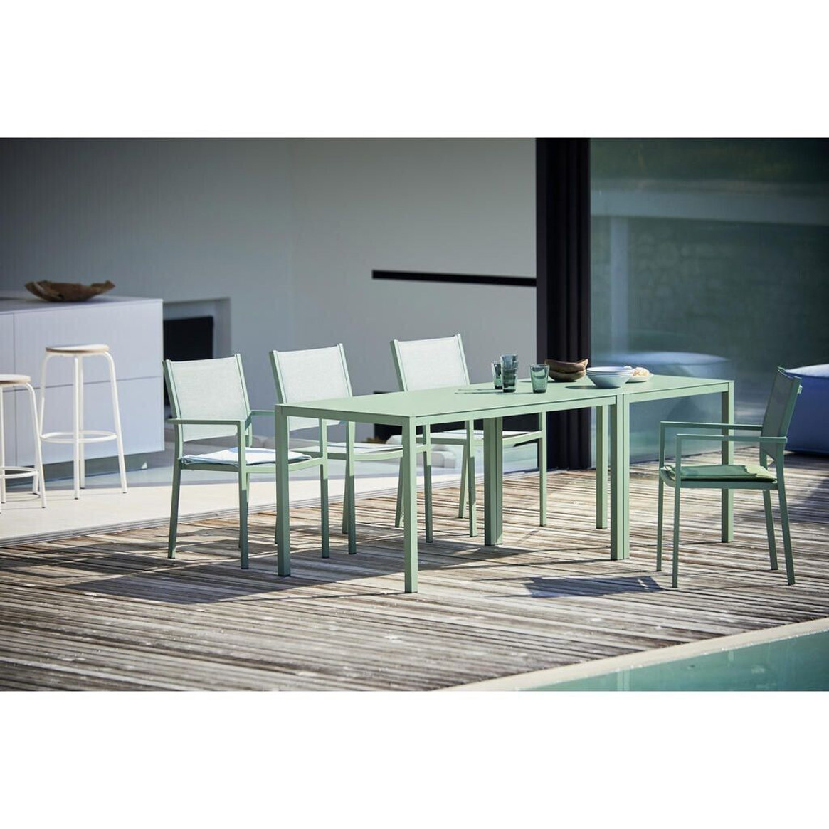 Die Tischplatte aus hochwertigem Aluminium in einem frischen Grünton bringt einen Hauch von Natur in Ihren Garten oder auf Ihre Terrasse. Sowohl das Gestell als auch die Tischplatte in der passenden Farbe sorgen für ein harmonisches Gesamtbild und machen diesen Tisch zu einem stilvollen Mittelpunkt Ihrer Gartenmöbel.