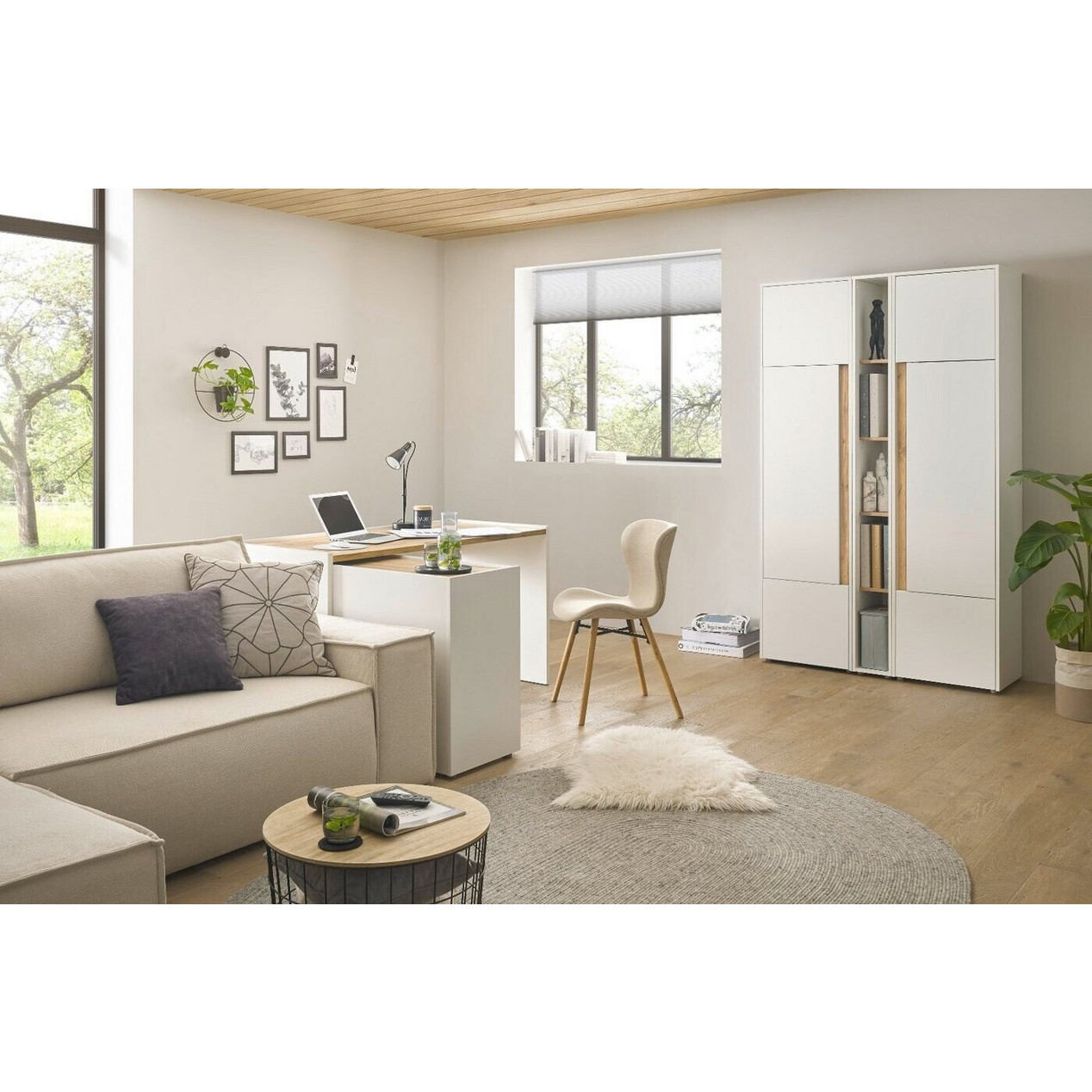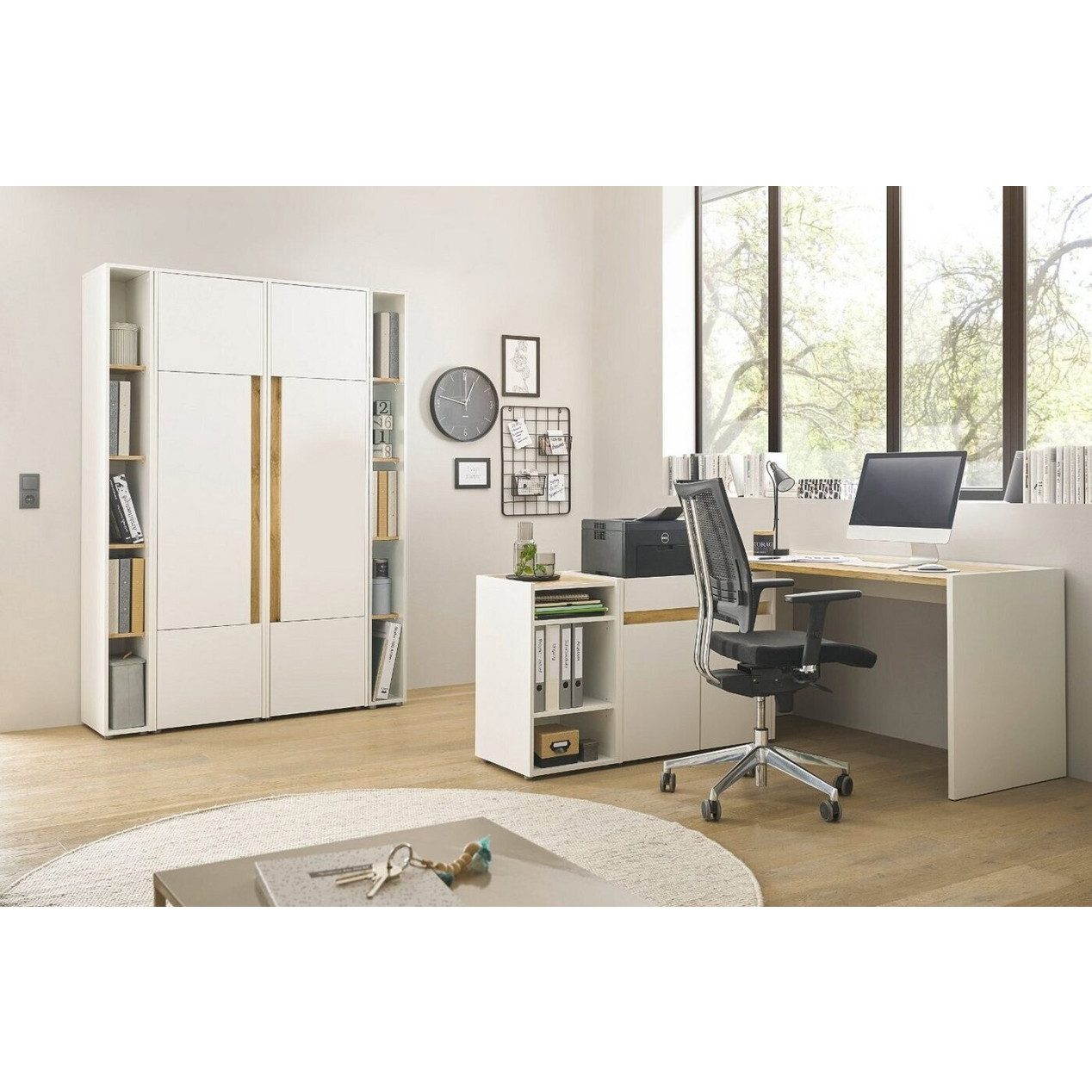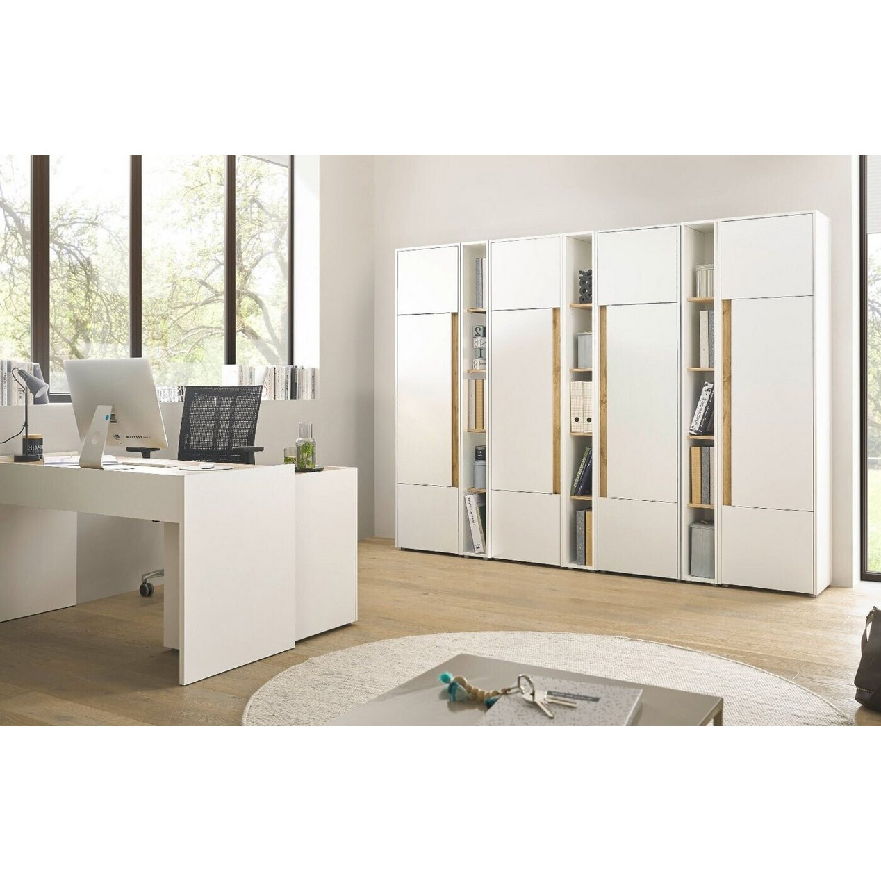 Entdecken Sie das stilvolle und funktionale Furn.Design Aktenschrank Set, das vier Stauraumschränke und drei Regale in einem eleganten Weiß und der ansprechenden Wotan Eiche bietet. Dieses Set ist ideal für Ihr Büro oder Home-Office und sorgt für Ordnung und Übersichtlichkeit.