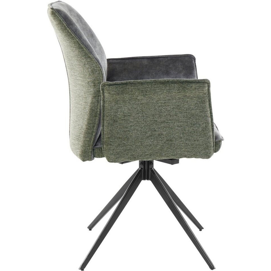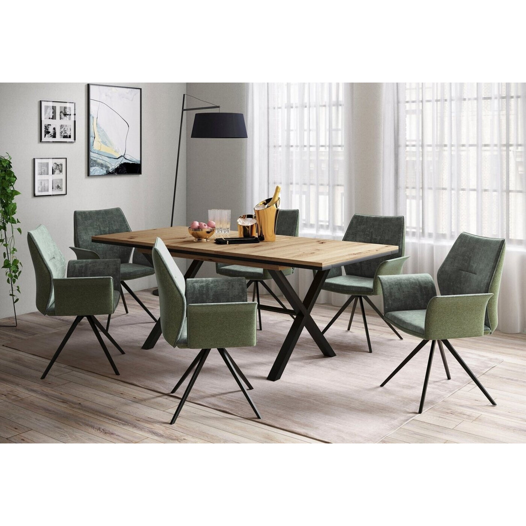 Die mit Armlehnen ausgestattete Sitzfläche ist nicht nur bequem, sondern auch für lange Mahlzeiten oder gesellige Runden perfekt geeignet. Die grüne Farbe der Sitz- und Rückenfläche bringt einen Hauch von Frische in jeden Raum und harmoniert besonders gut mit warmen Holztönen.