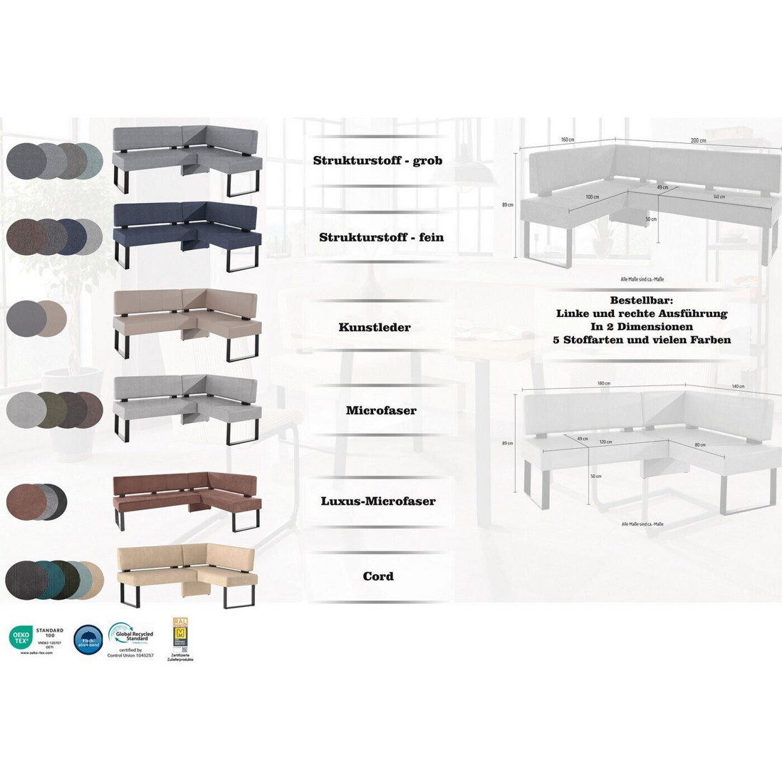 Das Gestell der Eckbank besteht aus robustem Metall, das Stabilität und Langlebigkeit gewährleistet. Der Bezug aus 100% Polyester ist nicht nur pflegeleicht, sondern auch angenehm für ein Sitzgefühl, das zum Verweilen einlädt. Mit einer Breite von 200 cm, einer Höhe von 89 cm und einer Tiefe von 160 cm bietet die Eckbank ausreichend Platz für die ganze Familie oder Freunde.
