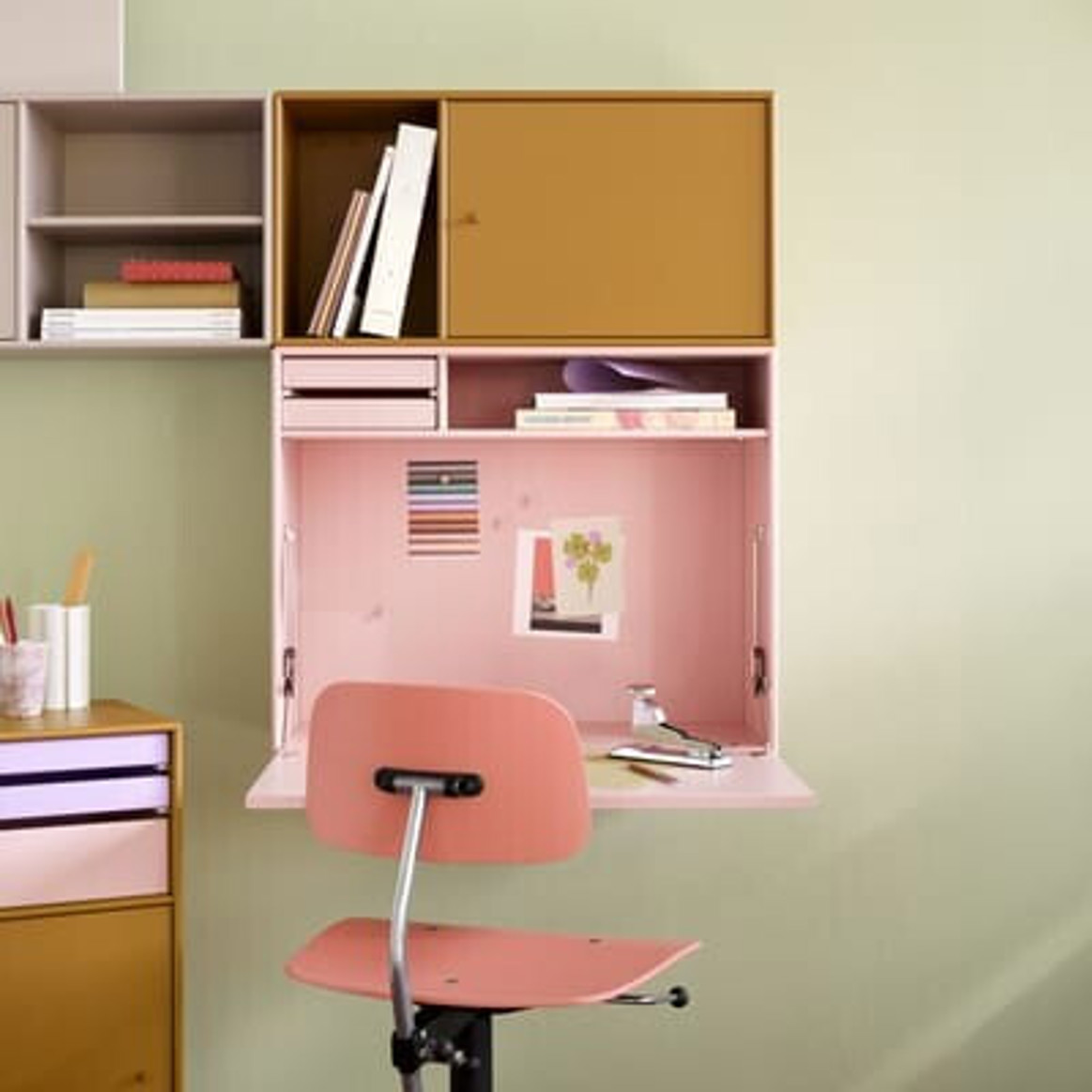 Entdecken Sie den eleganten montana: Studio Desk pine, der durch seine stilvolle grüne Farbe besticht. Der Wandschreibtisch ist aus hochwertigem Holz gefertigt und bietet eine robuste Konstruktion aus MDF, die sowohl Stabilität als auch Langlebigkeit garantiert.