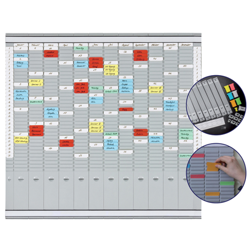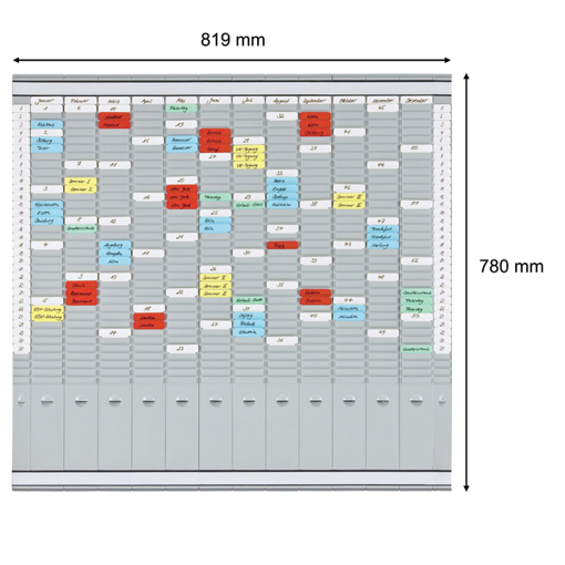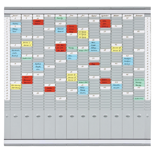 | Beschreibung der Besonderheiten: | 12 Täger, 35 Schlitze. Planer für Touren, Belegung oder als Projekt- oder Wochenplaner. Kapazität: 455 T-Karten. 7 Kartenträger mit je 35 Schlitzen für T-Karten Größe 2 und 1 Indexspalte mit 35 Schlitzen für T-Karten Gr. 1. |