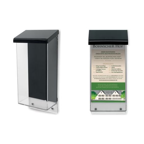 Mit einem durchdachten Design sorgt diese Prospektbox dafür, dass Ihre Flyer und Informationen optimal geschützt sind, während sie gleichzeitig leicht zugänglich bleiben. Sie eignet sich hervorragend zur Wand- oder Pfostenbefestigung, wobei die Montage flexibel und unkompliziert gestaltet ist. Beachten Sie bitte, dass das Montagematerial nicht im Lieferumfang enthalten ist.