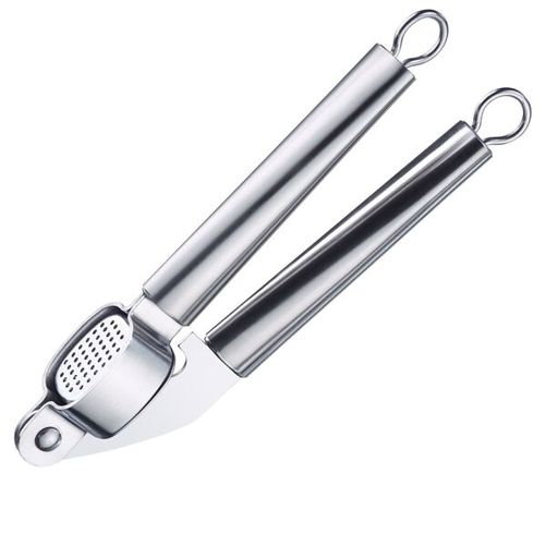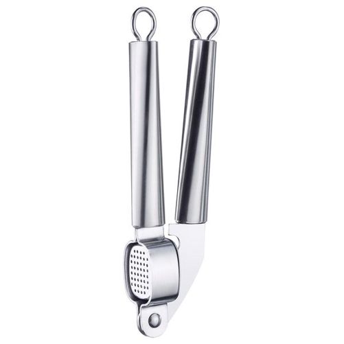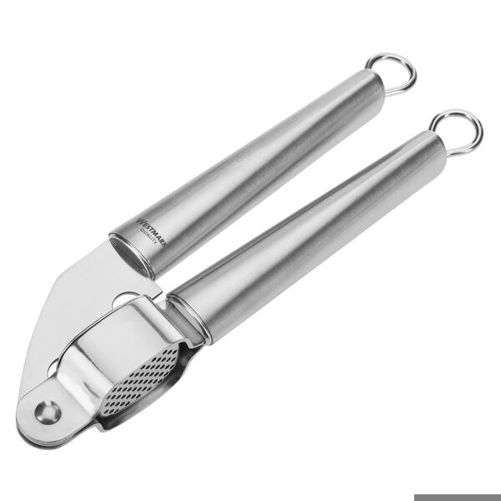mit herausnehmbarem Presseinsatz für feines Pressen von Knoblauch, Zwiebelstückchen oder Kapern, mühelose Handhabung durch abgerundete Griffe aus rostfreiem Edelstahl, Aufhäng-Ösen an Griffenden für einfaches Verstauen an der Wand
